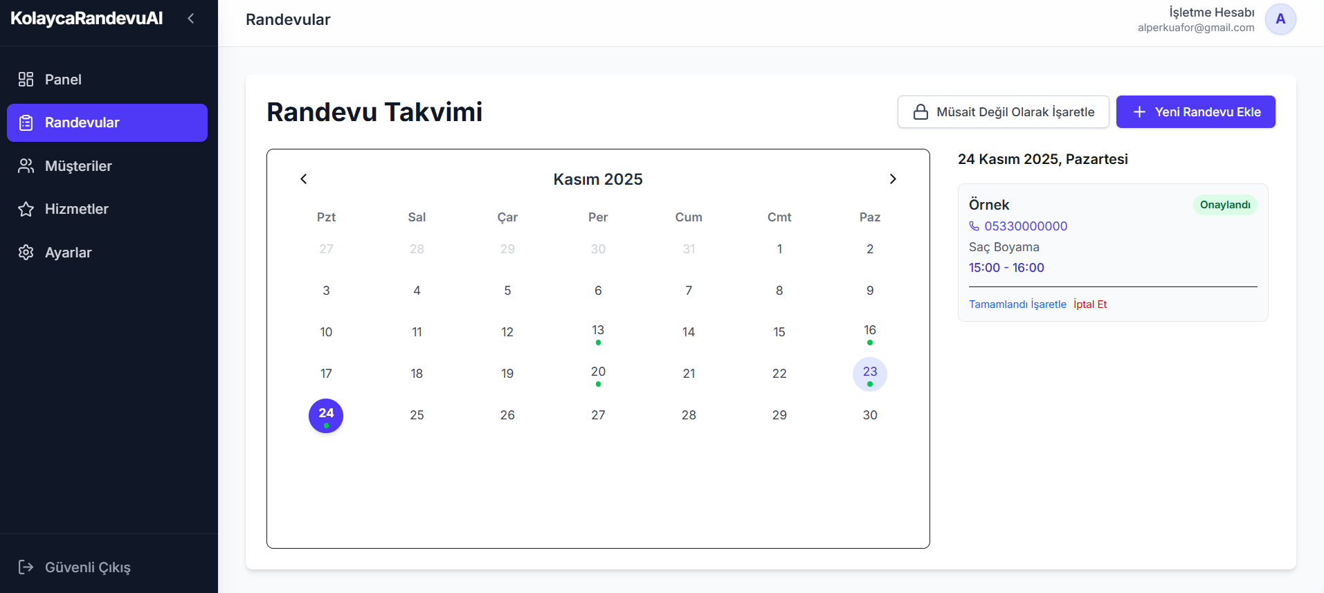 Randevu defteri, cevapsız aramalar ve karmaşık Excel dosyalarıyla vedalaşın. İşletmenizin tüm randevu ve müşteri yönetimini tek bir modern platformda toplayın.
