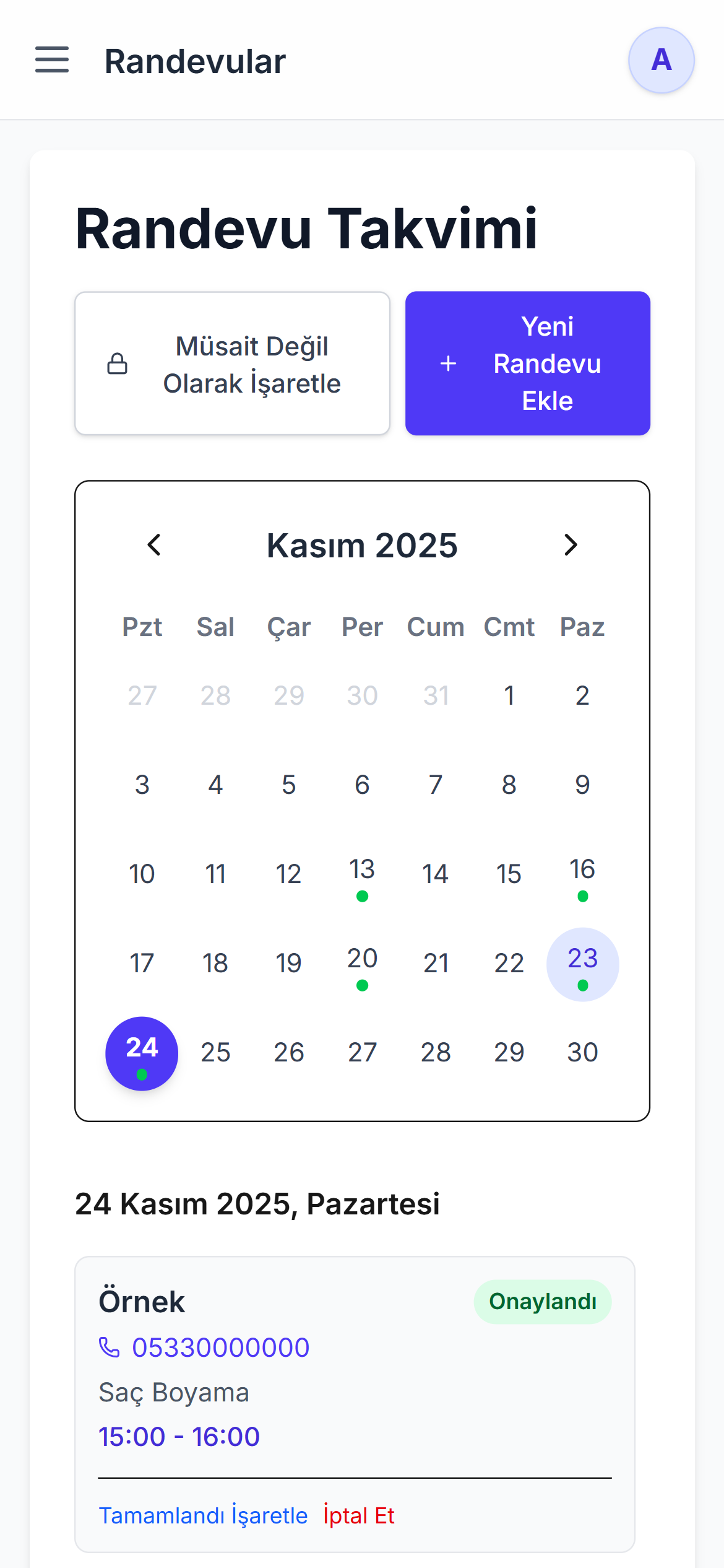 Evet! Yönetim panelimiz (dashboard) tamamen mobil uyumludur. Herhangi bir uygulama indirmenize gerek kalmadan, telefonunuzun veya tabletinizin web tarayıcısından tüm işlerinizi (randevu ekleme, müşteri takibi, ayarlar vb.) kolayca yönetebilirsiniz.